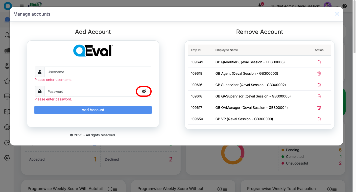 To add the new account, under the Add Account section, enter the Username and Password in the respective text-boxes of users available in the QEval system.