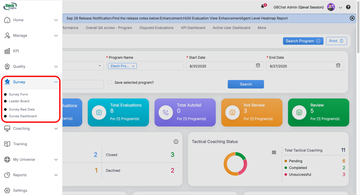 The Survey Module in the QEval portal is built to help users efficiently capture, manage, and analyze feedbacks. It allows the creation of customizable survey forms, supports distribution across multiple channels (SMS and Email), and ensures responses are seamlessly integrated into QEval’s analytics and reporting framework.