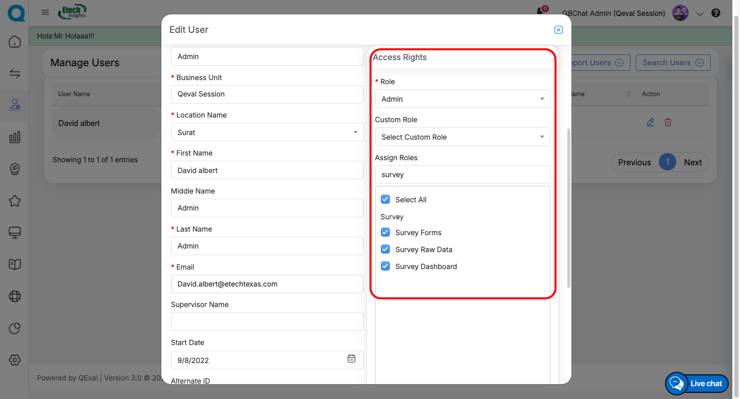 In QEval, access to Survey-related modules (Survey Forms, Survey Raw Data, and Survey Dashboard) can be controlled through the Manage Users section. Administrators can assign these rights to specific users by editing their access permissions.