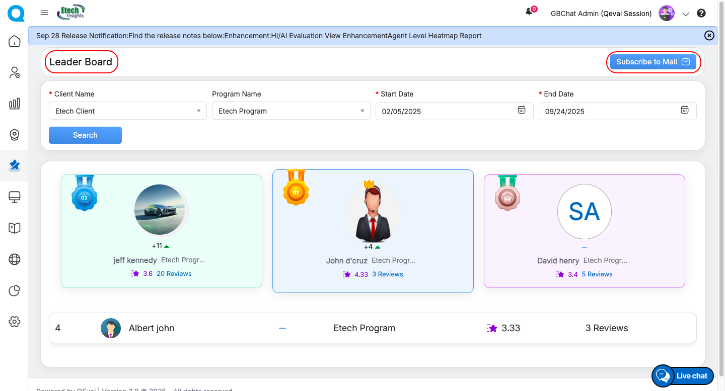 The Leaderboard dashboard in QEval offers a quick snapshot of performance based on feedback ratings. It enables managers and stakeholders to identify top performers, compare rankings, and analyze trends within a specific client or program.