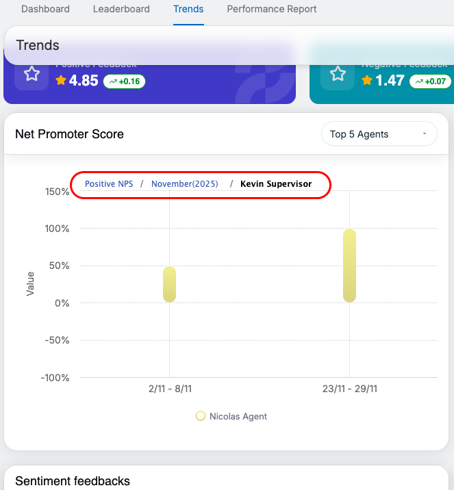 This drill-down flow—Month → Supervisor → Agent—enables focused analysis of NPS performance across time and organizational levels, supported by clear and informative tooltip interactions.