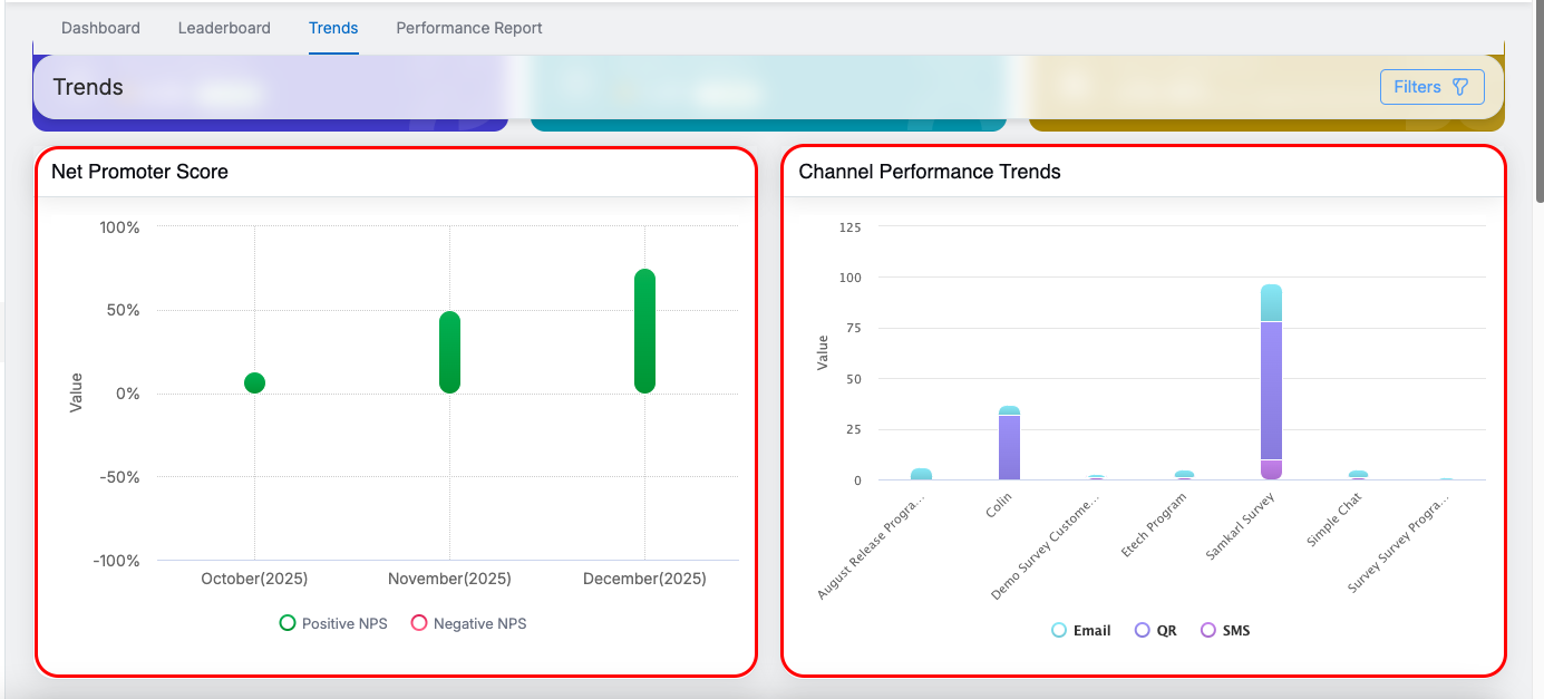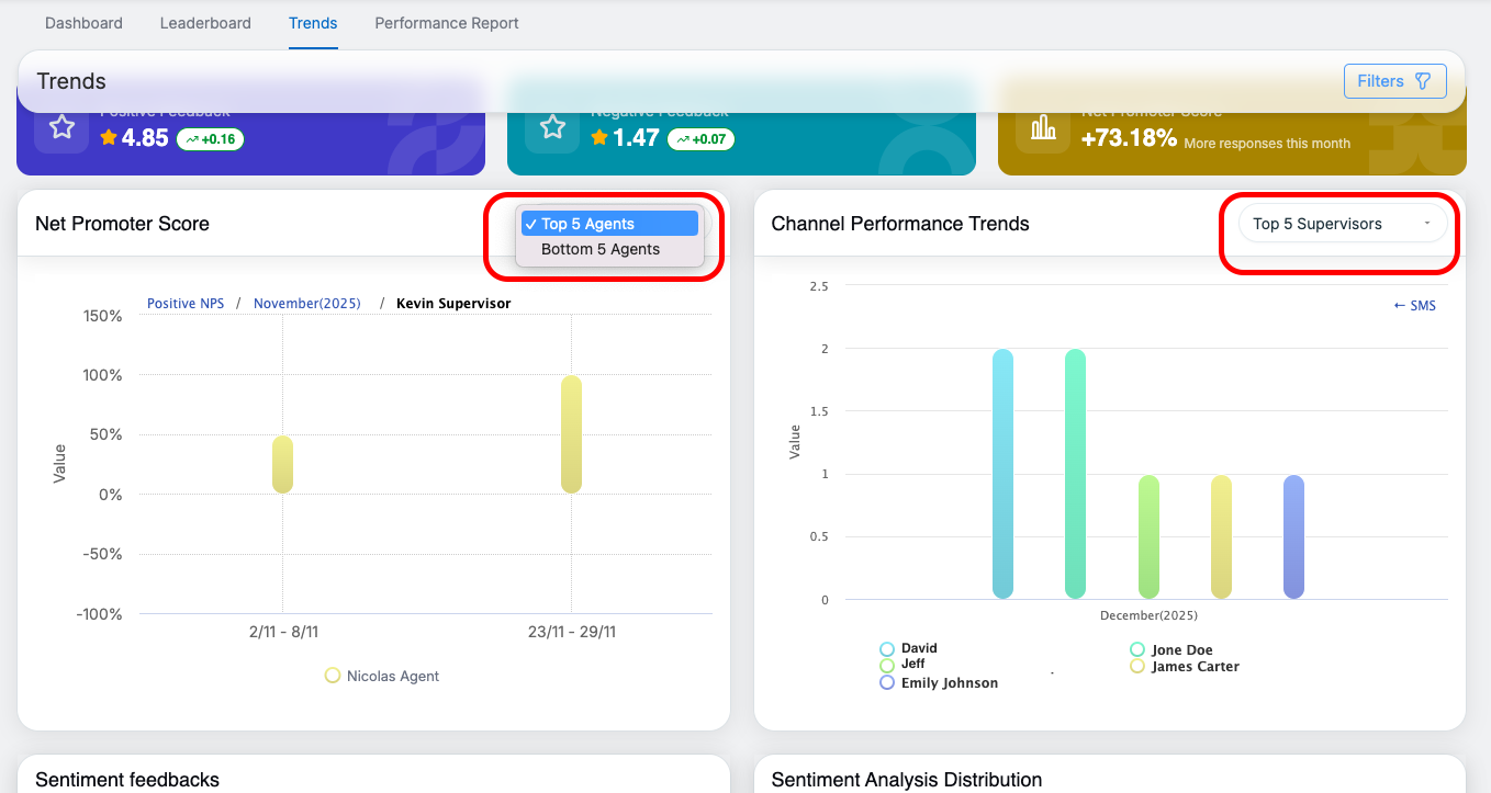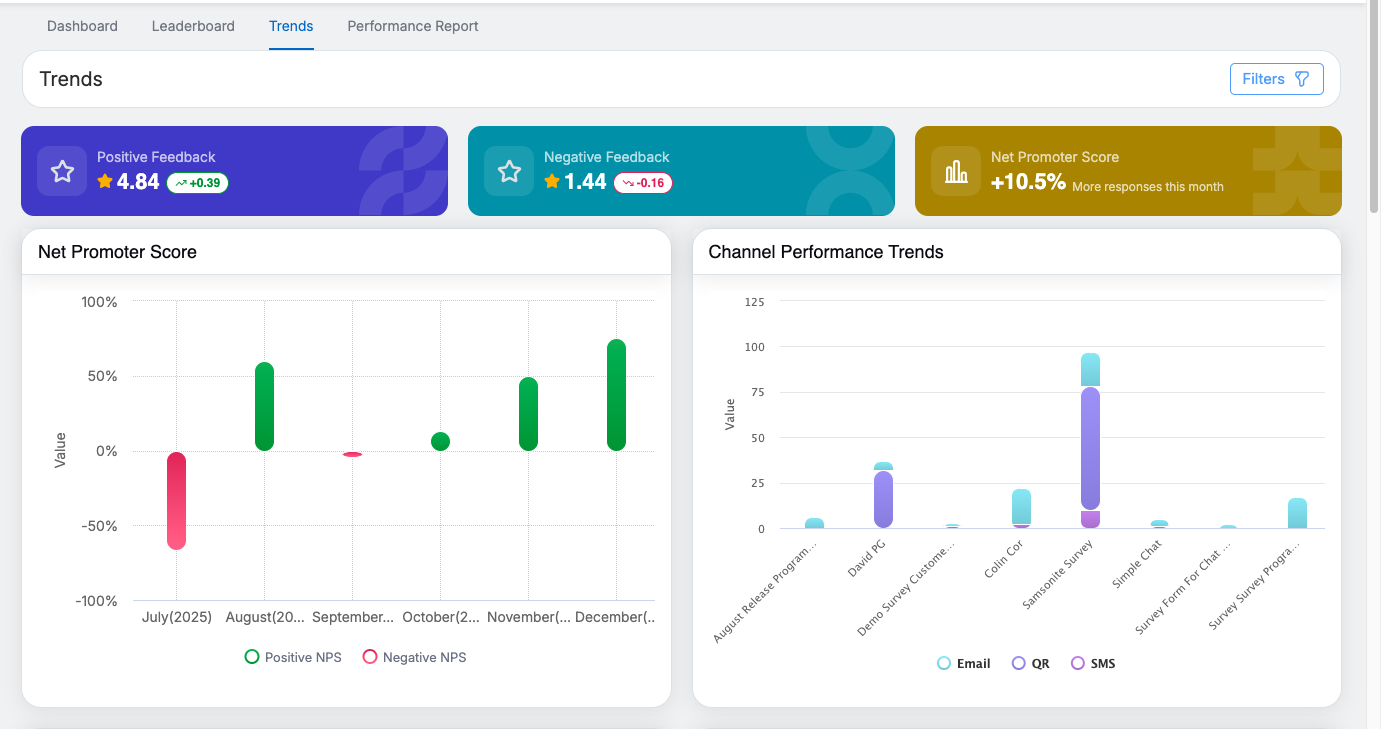 The Trends page in QEval helps users visualize survey performance over time. It enables analysis of customer sentiment, satisfaction trends, and performance comparisons across agents, supervisors, clients, brands, channels, and programs. All insights are presented through interactive charts and cards for quick interpretation.
