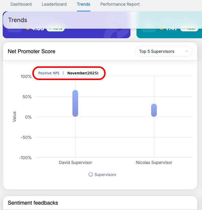 At the Supervisor level, performance data is displayed for supervisors associated with the selected month. A dropdown in the top-right corner of the chart allows users to switch between the Top 5 and Bottom 5 Supervisors based on NPS performance. Hovering over the chart displays supervisor-level metrics.