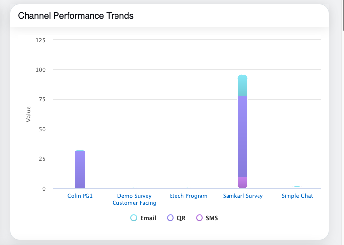 - Stacked bar chart showing performance by Email, SMS, and QR Code.