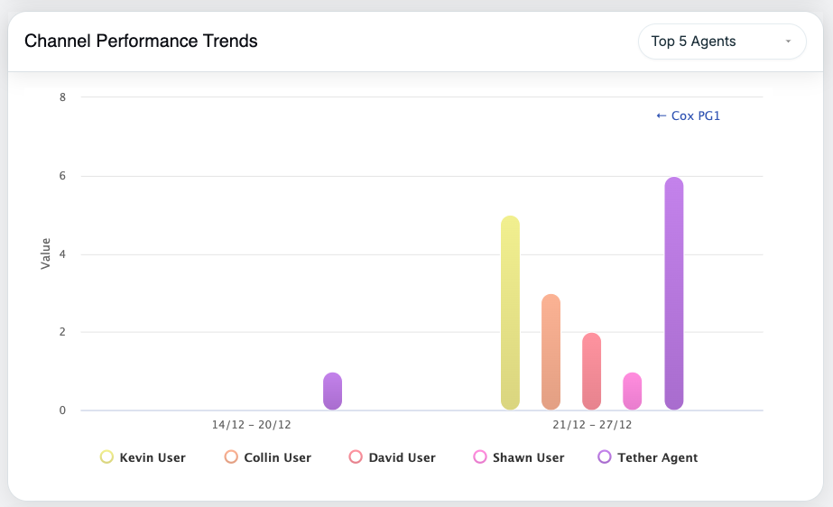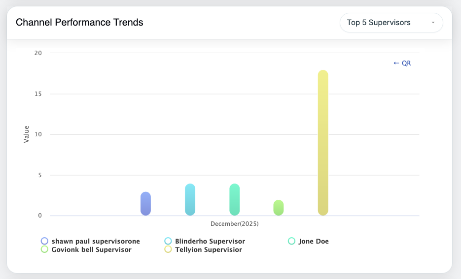 After selecting a channel, performance data is shown at the Supervisor level. A dropdown in the top-right corner of the chart allows users to toggle between the Top 5 and Bottom 5 Supervisors based on channel performance. Tooltips continue to provide clear metric details.