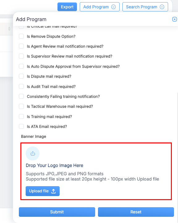 - You can also attach a logo while adding a program: click Add Program, enter the program details, scroll to the “Attach Program Logo” section, upload the logo, and click Submit.