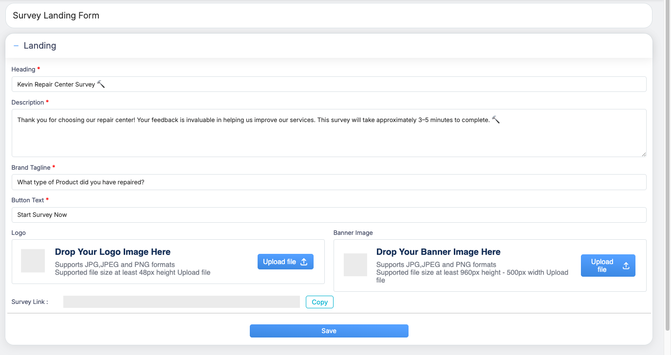 Once saved, the survey landing form is created and applied as the default landing page for surveys.